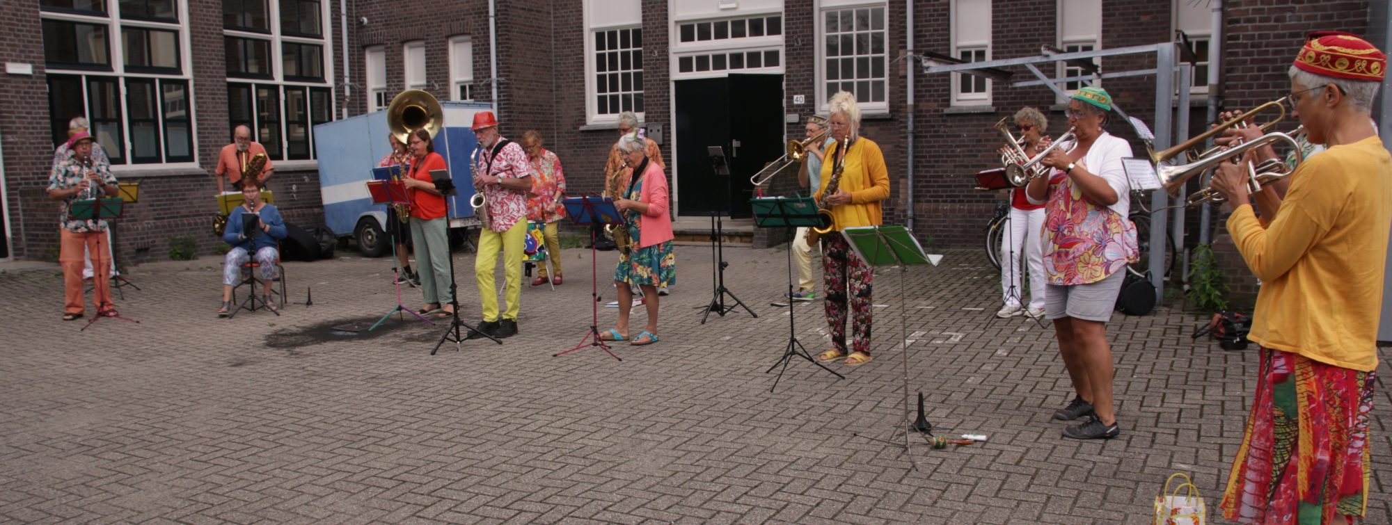 Tijdens ons repetitieweekend in het Popcentrum Den Haag spelen we kort buiten voor eigen publiek en voor onze fotograaf