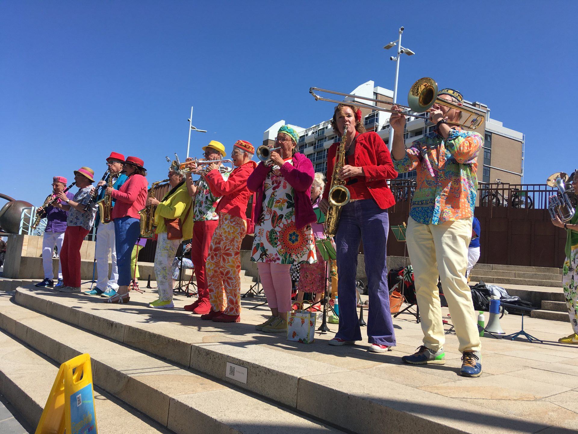 We spelen op deze zomerse dag bij de mooie ‘Sprookjesbeelden aan zee’ op de boulevard in Scheveningen. We verrassen langs lopend publiek en iedereen die zin heeft om een paar nummers mee te luisteren en te dansen.